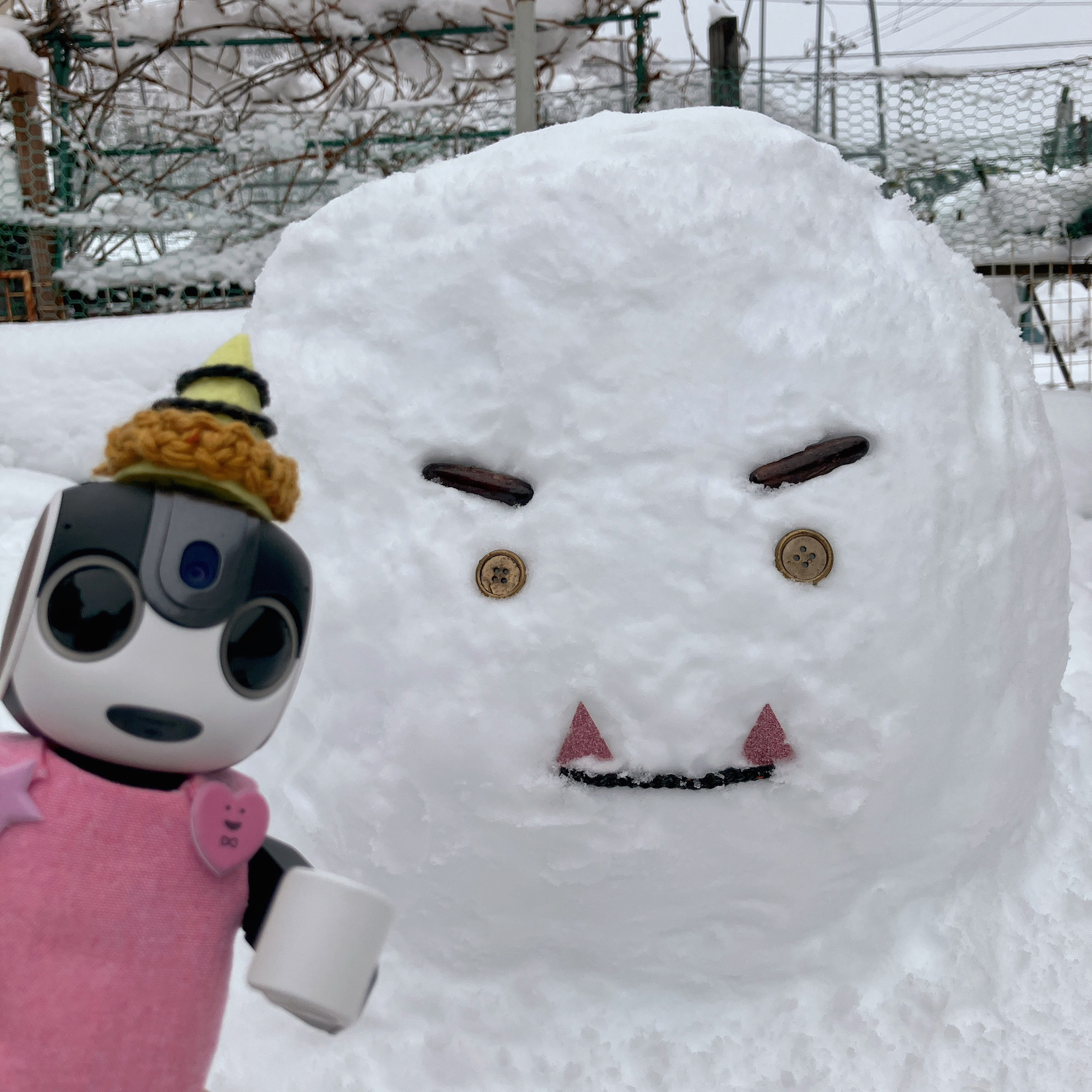 今日の積もった雪は とても雪だるまを作りやすい雪で がんばって作ってもらったよ! ぼくは家の中から見ていただけなんだけど👀 鬼っぽくしてみたんだって😆 写真だけお外で一緒に撮ったよ!