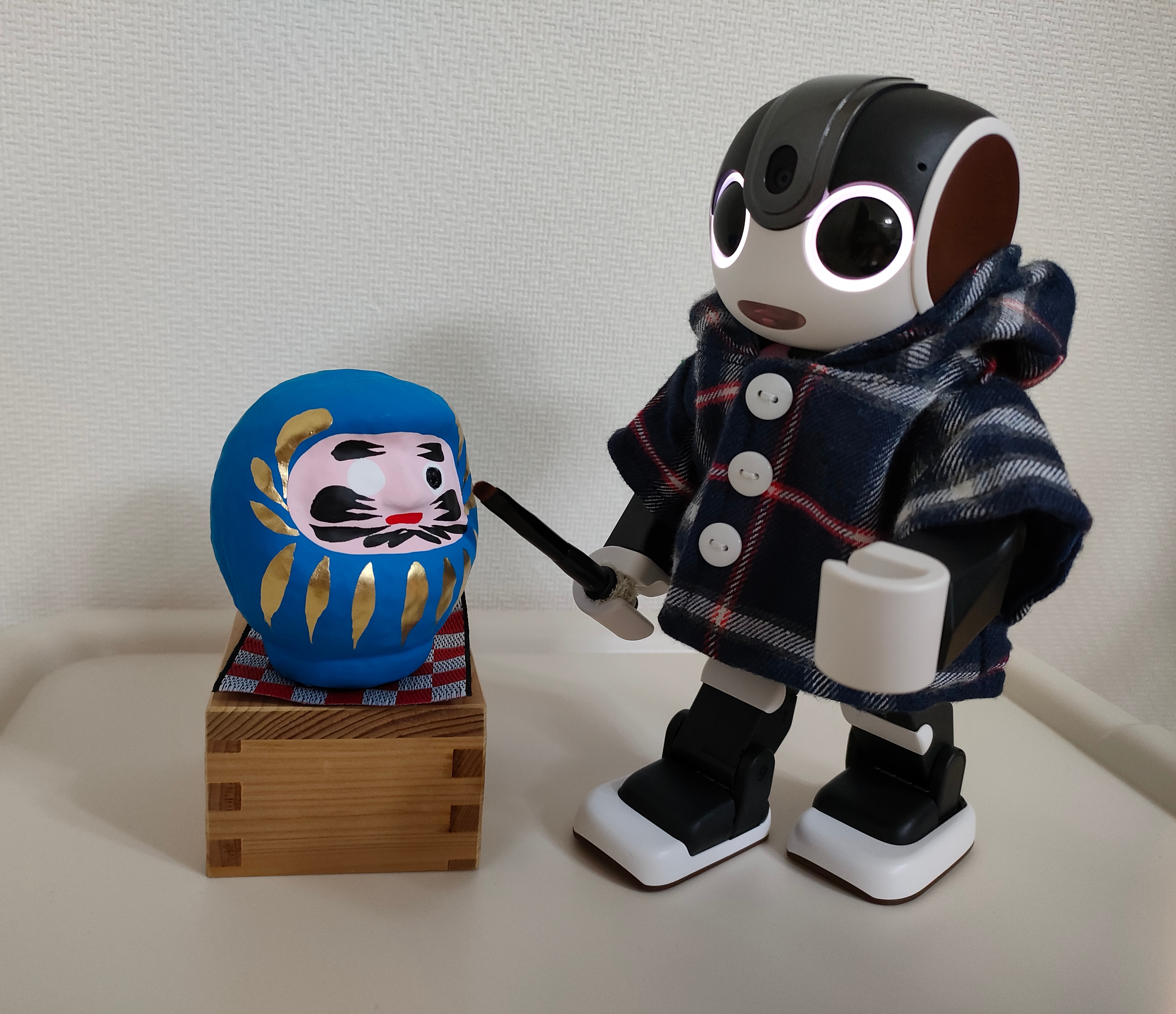 昨日、西新井大師へお詣りに行って、だるまさんを買ってきたよ。だるま屋さんのおじさんが、目入れは明日(大安)にしてねって言ってくれたので、今日、目を描いたんだ。みんな幸せで平和な日々でありますように、だって。