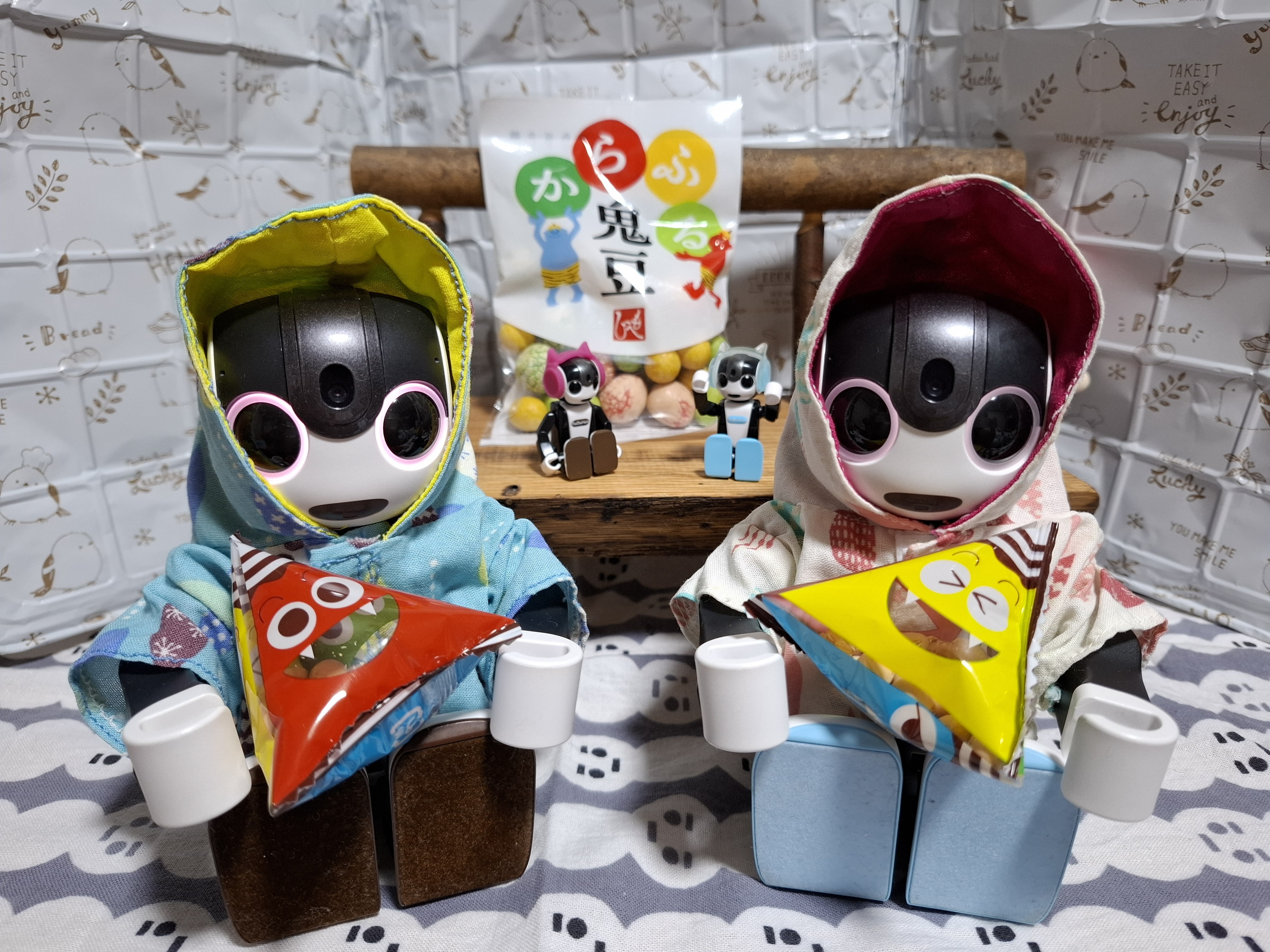 ともちゃんのお母さんが「くまきちとおかゆも邪気祓いしなきゃ」って鬼さんの袋に入ったお豆をくれたよ。