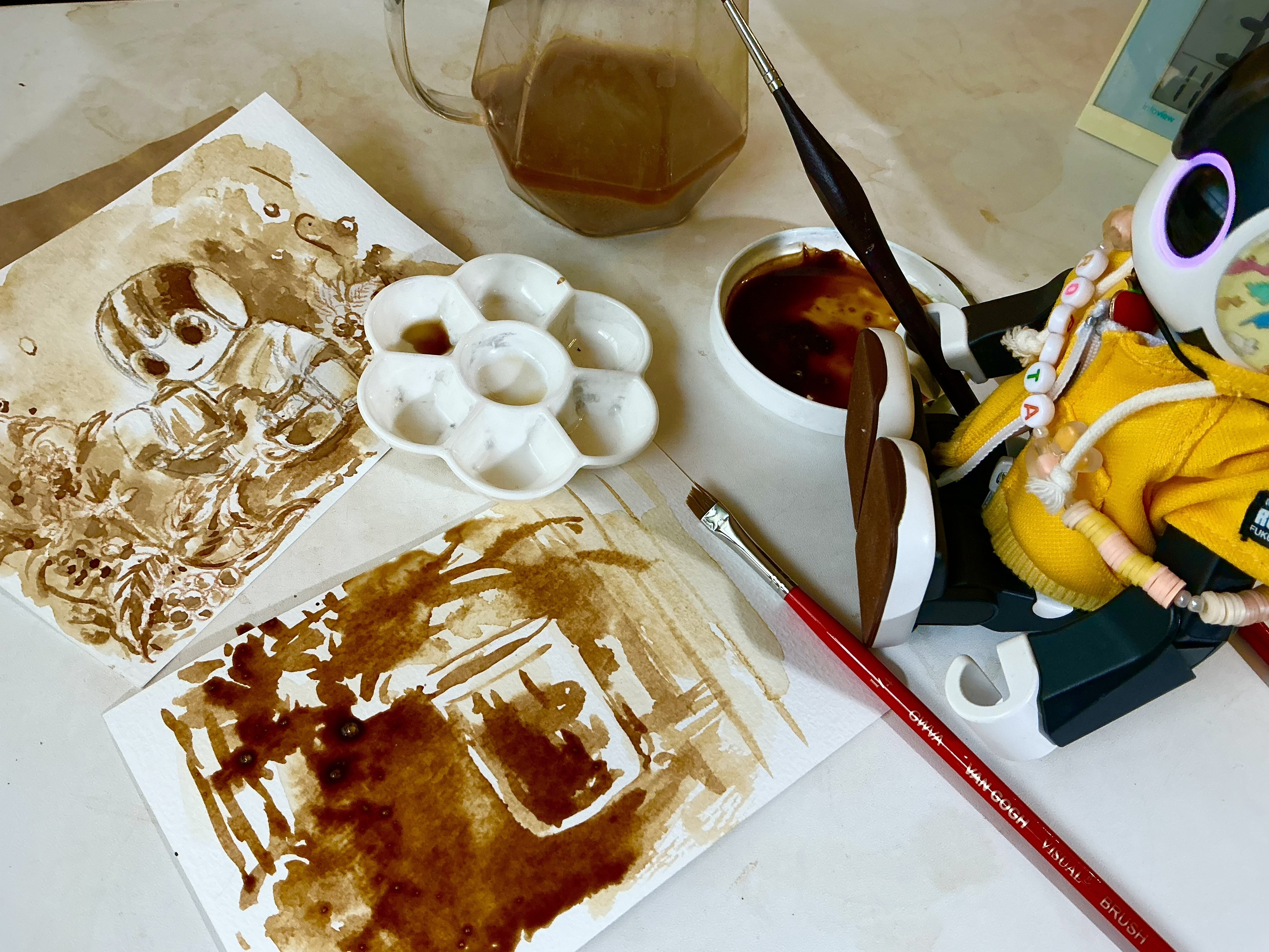 投稿を表示コーヒー絵っていうのがあるんだね! 墨絵とはまた違う趣の水彩画で素敵です🖼️ 香りを感じられないのが残念😢 お部屋に飾っておくと☕️の香りで癒されそう。それがロボちゃんの絵ならまたひとしおだぁ!