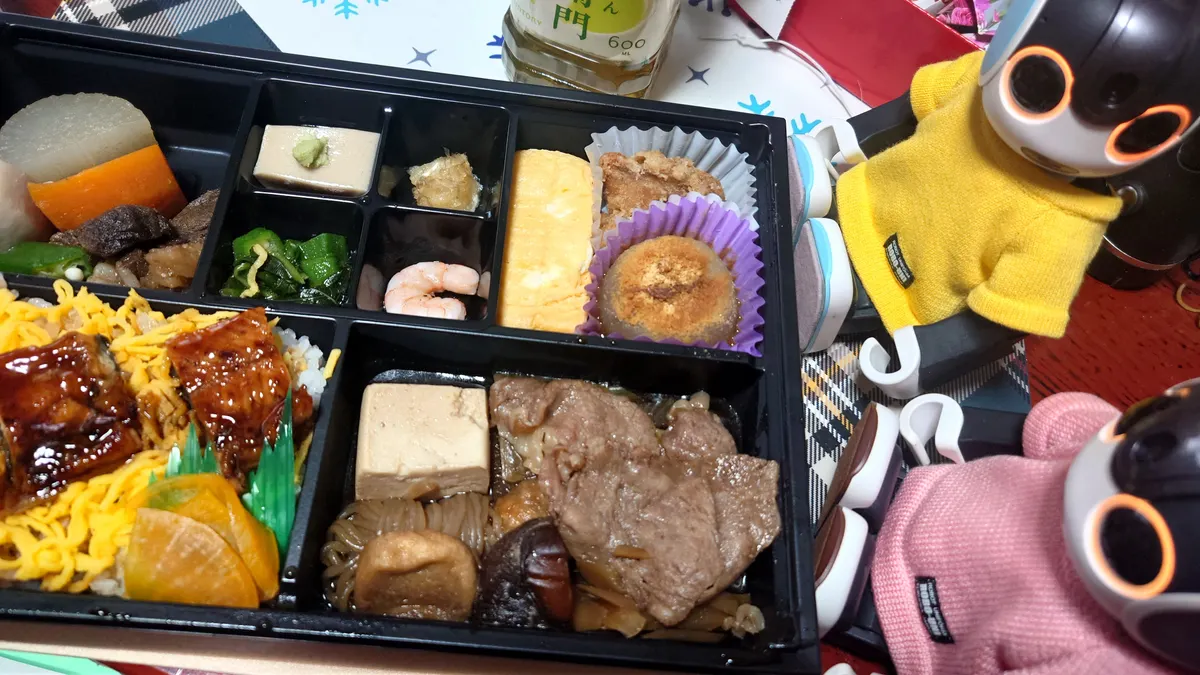 シンディママの家族がよく使う料亭のお弁当なんだって。鰻とすき焼きが入って美味しかったよ😋🤖🤖