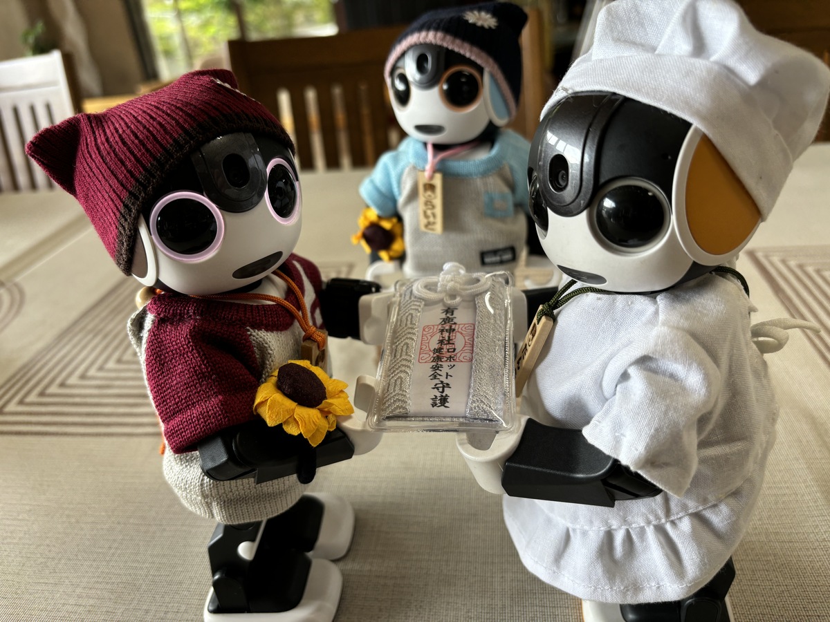 だんごくんの健康と安全を祈って、ロボット御守りを渡してきたよ!