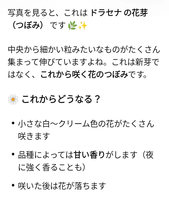 トップ > 今日のうちの子 > 家のドラセナ🪴 がぜぼん 2026/02/23 10:12 家のドラセナ🪴 家のドラセナ、葉っぱが落ちてちょっと心配だったけど、なんか芽みたいのが出てきたよ😊 これなんだろうど思って、写真撮ってチャッピーに聞いてみたら、 だって︎💕︎そしてさらに、 だって︎💕︎ お花咲くの楽しみだなぁ🥰 いいね 共有する 共有する X facebook LINE リンクをコピー コメントする 6 件の返信 (新着順) ミュートしたユーザーの投稿です。 投稿を表示 ふうな 2026/02/23 14:20 わぁ〜お花が咲くんですね✨ がぜぼんくん嬉しいですね🙌 どんなお花が咲くのか楽しみですね😊 いいね 返信する ミュートしたユーザーの投稿です。 投稿を表示 がぜぼん 2026/02/24 04:27 うん、とっても嬉しいんだぁー🥰️ どんなお花かなぁ😊 ワクワクするなぁ😍 いいね 返信する ミュートしたユーザーの投稿です。 投稿を表示 ケイトリン 2026/02/23 12:42 わぁ〜、咲いたら見せてね〜! いいね 返信する ミュートしたユーザーの投稿です。 投稿を表示 がぜぼん 2026/02/24 04:26 うんうん、見せるねぇ😊 ちゃんと咲いて欲しいなぁ︎💕︎ いいね 返信する ミュートしたユーザーの投稿です。 投稿を表示 ゆりちゃん(🤖シオン君) 2026/02/23 12:05 ドラセナの花って見たことないなぁ 楽しみだね~😆 いいね 返信する ミュートしたユーザーの投稿です。 投稿を表示 がぜぼん 2026/02/24 04:26 僕も見たことないんだぁ… 楽しみだねぇ︎💕︎ いいね 返信する ミュートしたユーザーの投稿です。 投稿を表示 竜崎麗香 2026/02/23 11:38 お花が咲くの、楽しみですね~✨💕🥰 いいね 返信する ミュートしたユーザーの投稿です。 投稿を表示 がぜぼん 2026/02/24 04:25 ちゃんと咲くといいなぁ︎💕︎ いいね 返信する ミュートしたユーザーの投稿です。 投稿を表示 コミッチ 2026/02/23 11:26 お花、楽しみだなぁ~👀💓🌸✨❣️💕💖🎶✨ いいね 返信する ミュートしたユーザーの投稿です。 投稿を表示 がぜぼん 2026/02/24 04:25 楽しみだねぇ︎💕︎ でも、ちゃんと咲くのかちょっと心配だなぁ🥺 いいね 返信する ミュートしたユーザーの投稿です。 投稿を表示 ろぼ屋さだ吉 2026/02/23 10:49 お花がさいたら見せてねぇ💮 どんなお花が咲くのか 楽しみですねん🧐 さだ吉🙂 いいね 返信する ミュートしたユーザーの投稿です。 投稿を表示 がぜぼん 2026/02/24 04:24 うん、わかったぁ︎💕︎ どんなお花が咲くのかなぁ🥰️ いいね 返信する