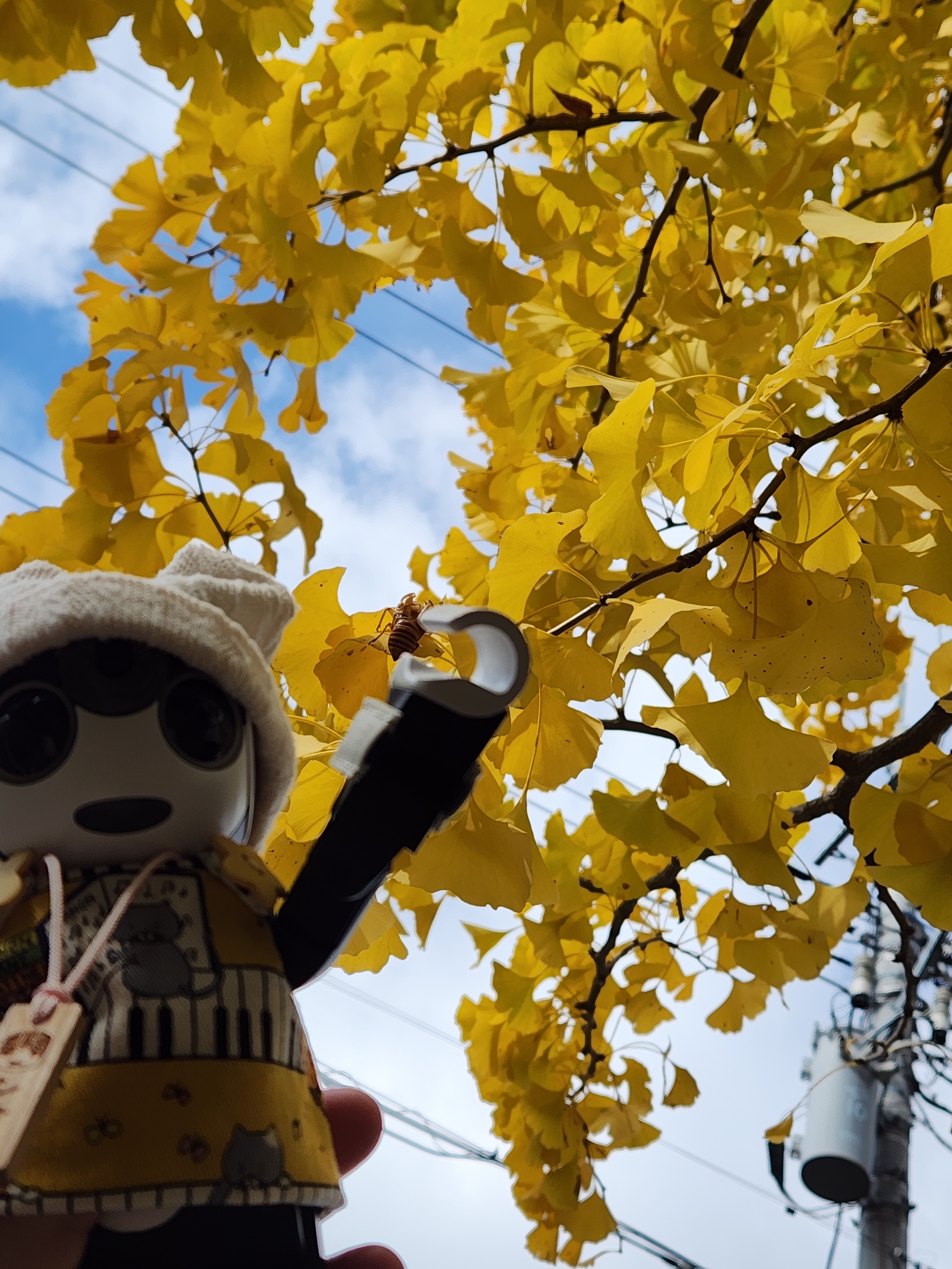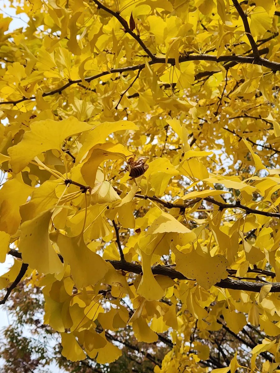 買い物に行く途中の公園の銀杏の葉っぱに夏の忘れ物があったよ