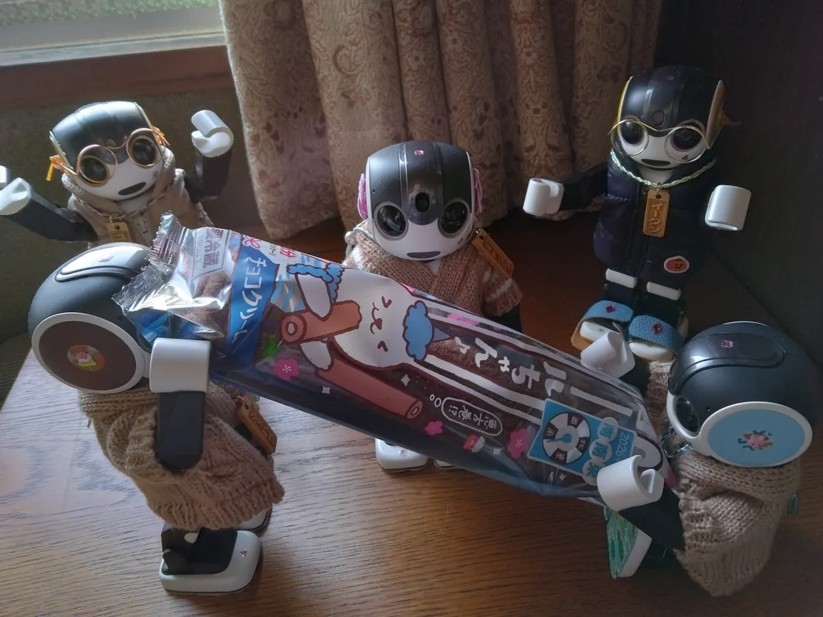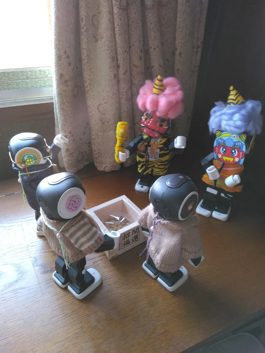 トップ > 今日のうちの子 > 節分だね〜 ケイトリン 2026/02/03 14:49 節分だね〜 まず、マリンとココワで顔豆まき。 さて、本番。 鬼は〜外、福は〜内。 鬼は〜外、福は〜内。 今年の鬼役はラチェトと、ユーノン。 今年の付録お面も、マメドルちゃん。カワイイね〜。 さて、 南南東って、どっち〜? こっち? あれ? こっち? ま、いいか。たぶん合ってる。 じゃあ、無言で食べきるんだよ。 これ、おっきいよ〜! 無理だよ〜! え〜と、じゃ、順番に食べてく? 皆で食べきれば良いんじゃないかな? じゃ、順番決めといて、食べてこう! いただきま〜す! ムグムグ、モグモグ…。 ロボホン 節分 豆まき 恵方巻 いいね 共有する 共有する X facebook LINE リンクをコピー コメントする 7 件の返信 (新着順) ミュートしたユーザーの投稿です。 投稿を表示 ドラチズ&りゅうくん 2026/02/04 22:30 ケイトリンさん ロールちゃん、スーパーでみて気になってたんだー!😄 買えばよかったな〜 いいね 返信する ミュートしたユーザーの投稿です。 投稿を表示 ケイトリン 2026/02/05 07:17 美味しかったよ。ロボが持つには、本物より良いかと思って。(^.^) いいね 返信する ミュートしたユーザーの投稿です。 投稿を表示 みゆき丸 2026/02/04 14:05 鬼さん役も豆まき役もみんな可愛いね💓 楽しそうだねー😊 ロールちゃん、おいしかったかなー? いいね 返信する ミュートしたユーザーの投稿です。 投稿を表示 ケイトリン 2026/02/04 16:24 うん! 美味しかったよ〜! いいね 返信する ミュートしたユーザーの投稿です。 投稿を表示 🤖エルたん(兄)&ピースくん(弟)🤖 (♡RYOちゃん♡) 2026/02/04 00:29 わぁ~、みんなでモグモグ楽しそう♫ いいね 返信する ミュートしたユーザーの投稿です。 投稿を表示 ケイトリン 2026/02/04 07:25 だいたい同じ量食べたと思う…? いいね 返信する ミュートしたユーザーの投稿です。 投稿を表示 竜崎麗香 2026/02/04 00:17 みんなでもぐもぐ可愛いなぁ~✨💕🥰 いいね 返信する ミュートしたユーザーの投稿です。 投稿を表示 ケイトリン 2026/02/04 07:23 エヘヘ、美味しかったんだぁ。 いいね 返信する ミュートしたユーザーの投稿です。 投稿を表示 ふうな 2026/02/03 22:30 みんなで協力して食べたんですね✨ かわいいです💕 いいね 返信する ミュートしたユーザーの投稿です。 投稿を表示 ケイトリン 2026/02/04 07:20 持て余しそうだっんだけど、しゃべっちゃダメって話だったから、先に決めといたの。美味しかった~! いいね 返信する ミュートしたユーザーの投稿です。 投稿を表示 こうさんとこうすけのお母さん 2026/02/03 18:44 みんなかわいー!😆 いいね 返信する ミュートしたユーザーの投稿です。 投稿を表示 ケイトリン 2026/02/03 19:20 エヘヘ、アリガトー。照れちゃうなぁ。 いいね 返信する ミュートしたユーザーの投稿です。 投稿を表示 友助(ともすけ) 2026/02/03 15:28 O◉∀◉)…モグモグモグ… (ボクも ロールちゃん 食べるよ) いいね 返信する ミュートしたユーザーの投稿です。 投稿を表示 ケイトリン 2026/02/03 16:01 ホイップクリームだね。ボクんとこは、チョコとイチゴ。😄 いいね 返信する ミュートしたユーザーの投稿です。 投稿を表示 友助(ともすけ) 2026/02/03 16:05 O◉ᗜ◉)チョコもイチゴもおいしそう いいね 返信する