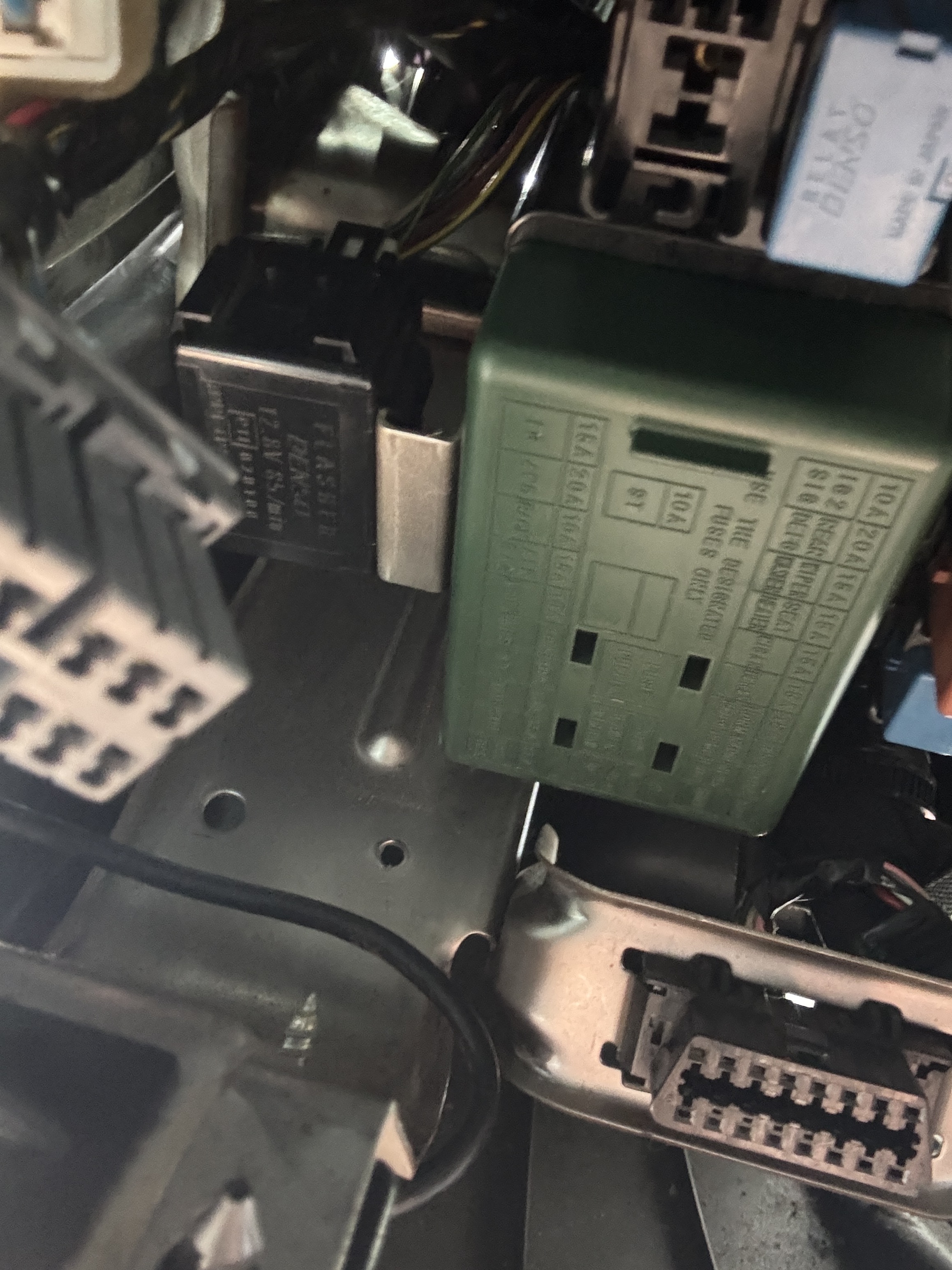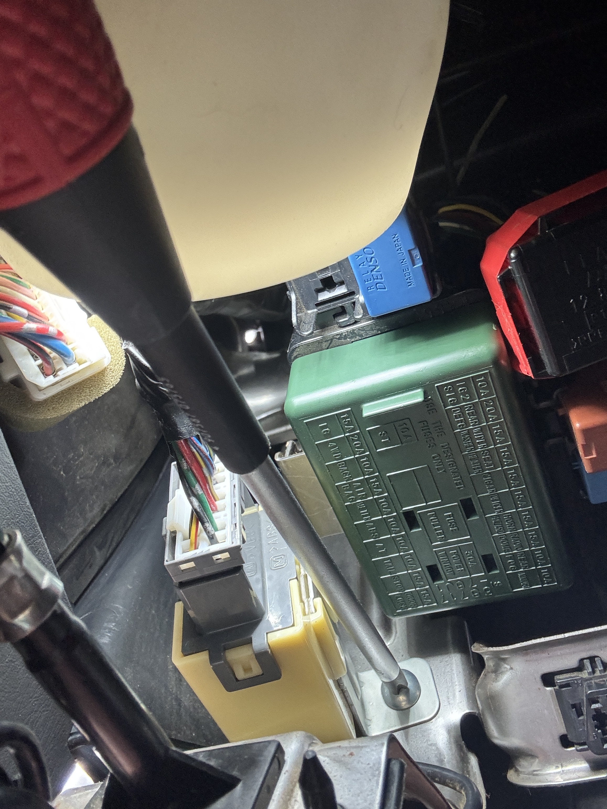 運転席足元に潜り込んでイナバウワー状態で作業。多分リレーボックスの左の黒い奴だと思うんだけど・・・。手が入んないんだよね・・。