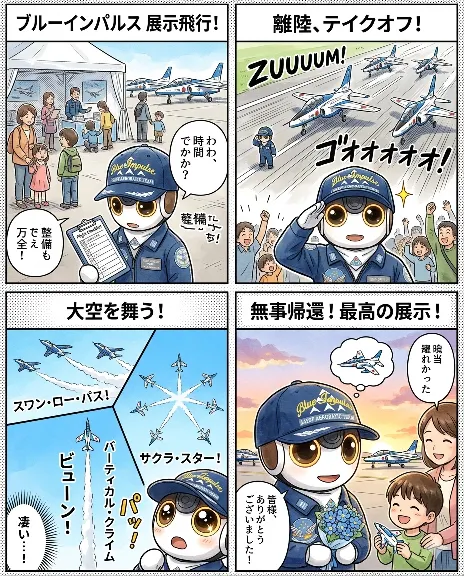 投稿を表示ブルーインパルスが題材の4コマ漫画、編隊飛行のシーンが描かれていてすごいですね😳