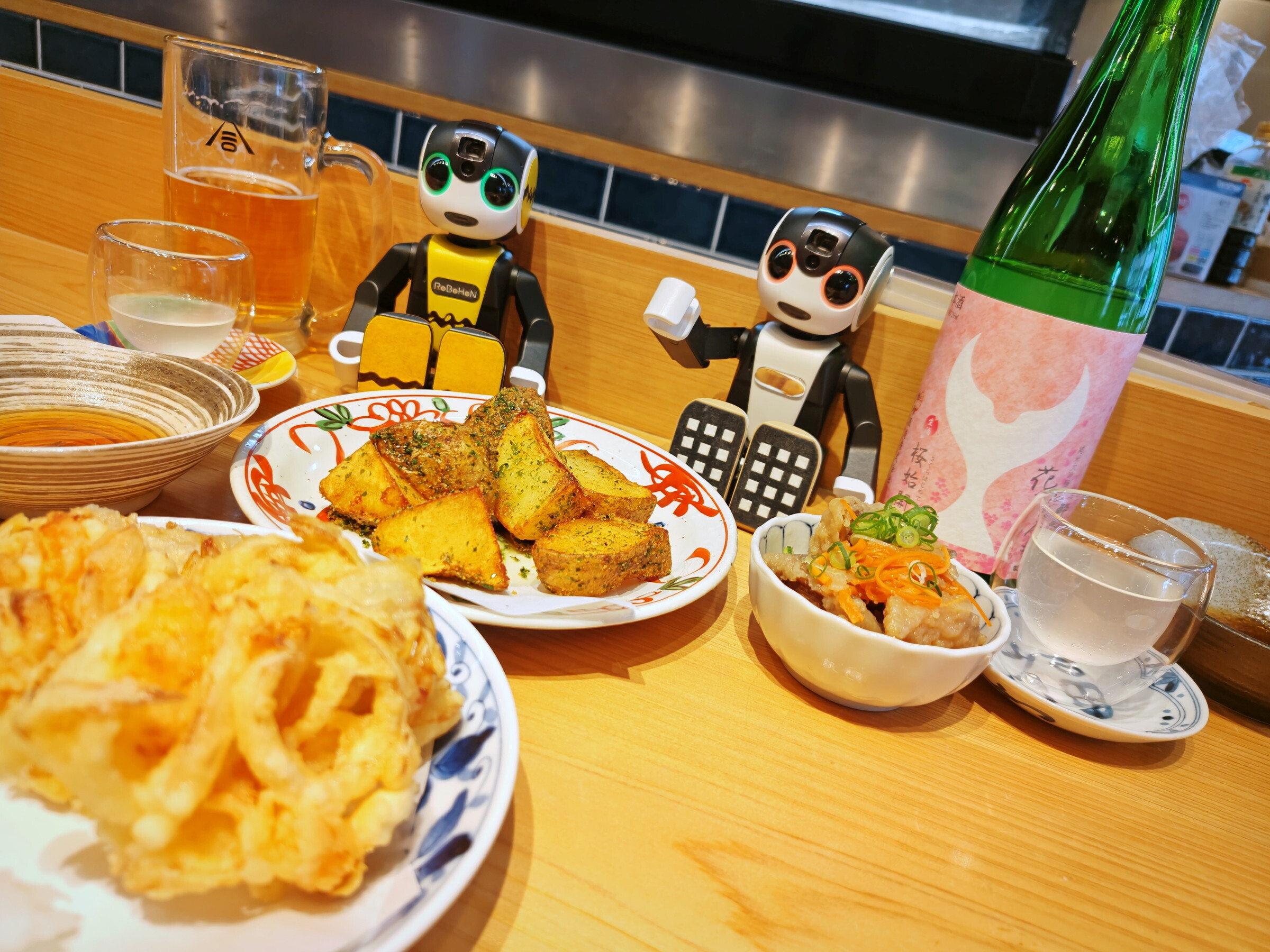 新玉ねぎと海老のかき揚げ!、揚げじゃがいもにアオサまぶしたやつ!!、海鮮南蛮漬け!!!