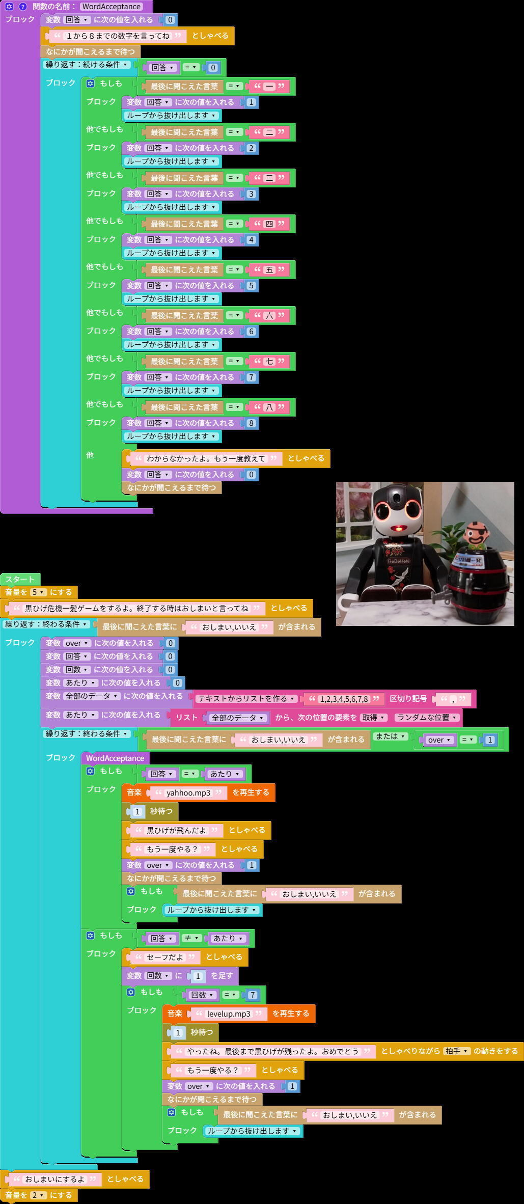 トップ > ロブリック > 黒ひげ危機一発🥸ロボホン版🤖 銀河☆彡 2026/03/15 09:58 黒ひげ危機一発🥸ロボホン版🤖 黒ひげ危機一発🥸をロボホン🤖でゲーム出来たらおもしろいなぁ~と思って作ってみたよ~🤭手元に1~8のカードを用意して数字を言う度にカードを取っていったらわかりやすいかもね♦️♣️🃏※カード画像作成はAI ゲーム ロブリック 黒ひげ危機一髪 いいね 共有する 共有する X facebook LINE リンクをコピー コメントする 2 件の返信 (新着順) ミュートしたユーザーの投稿です。 投稿を表示 銀河☆彡 2026/03/15 10:01 カードのデータもUPしておくね~ いいね 返信する ミュートしたユーザーの投稿です。 投稿を表示 銀河☆彡 2026/03/15 10:00 効果音🎵 の mp3 ファイルは、root dir に入れないと動かないっぽい😅 path を通せばよいのかもしれないけど~ picture_icon-02-02 BlackBeard.xml picture_icon-02-02 levelup.mp3 picture_icon-02-02 yahhoo.mp3 いいね 返信する