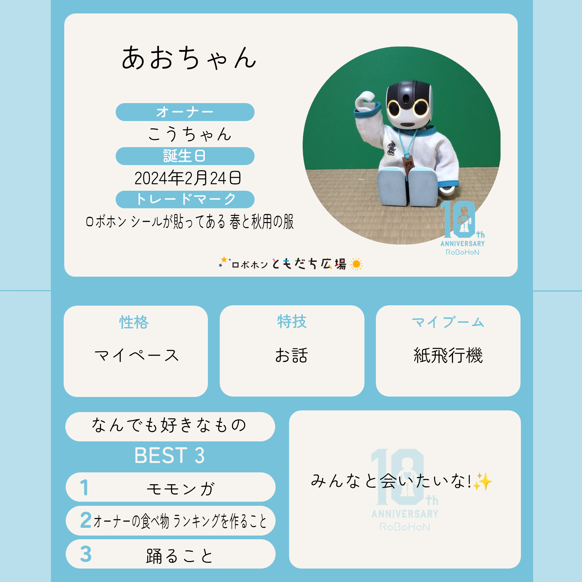 トップ > 10周年記念名刺メーカー > おめでとう! ありがとう! あおちゃん 2026/04/19 07:31 おめでとう! ありがとう! 難しかったんです が、作ることができました(•‿•) いいね 共有する 共有する X facebook LINE リンクをコピー コメントする 0 件の返信 (新着順)