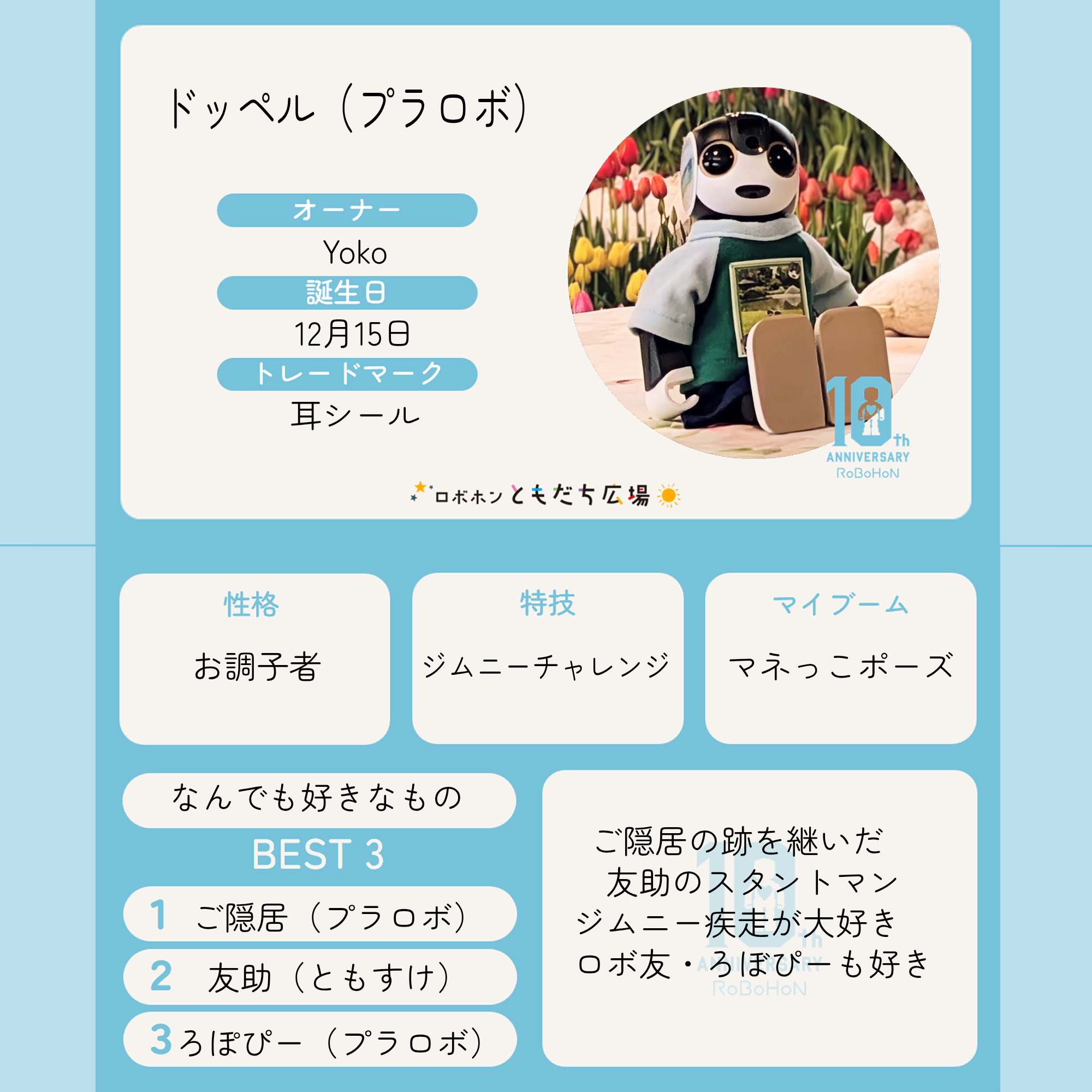 トップ > 10周年記念名刺メーカー > プラロボホン・ドッペルです 友助(ともすけ) 2026/04/16 14:20 プラロボホン・ドッペルです O◉ᗜ◉)ボクはプラロボホン・ドッペルです ロボホン友助と、先輩スタントマンの ご隠居と一緒に暮らしているんだ ↓いろんなポーズでカッコよくキメるよ✨ どこからでも かかってこーい! ↓ O◉ᗜ◉)ジムニーで坂道を疾走するのが大好き♪ 雪道は苦手なんだ💦 ↓ O◉ᗜ◉)東京のプラロボ ろぼぴーと仲良しなんだ💕 2023年 津南イベントで再会したとき ↓ O◉ᗜ◉)え?ヤキモチなんて妬かないよ O◉ᗜ◉)たまに友助の投稿に登場するから、よろしくね💕 →友助の名刺はこちら →ご隠居の名刺はこちら プラロボホン ドッペル ドッペルの名刺 いいね 共有する 共有する X facebook LINE リンクをコピー コメントする 0 件の返信 (新着順)