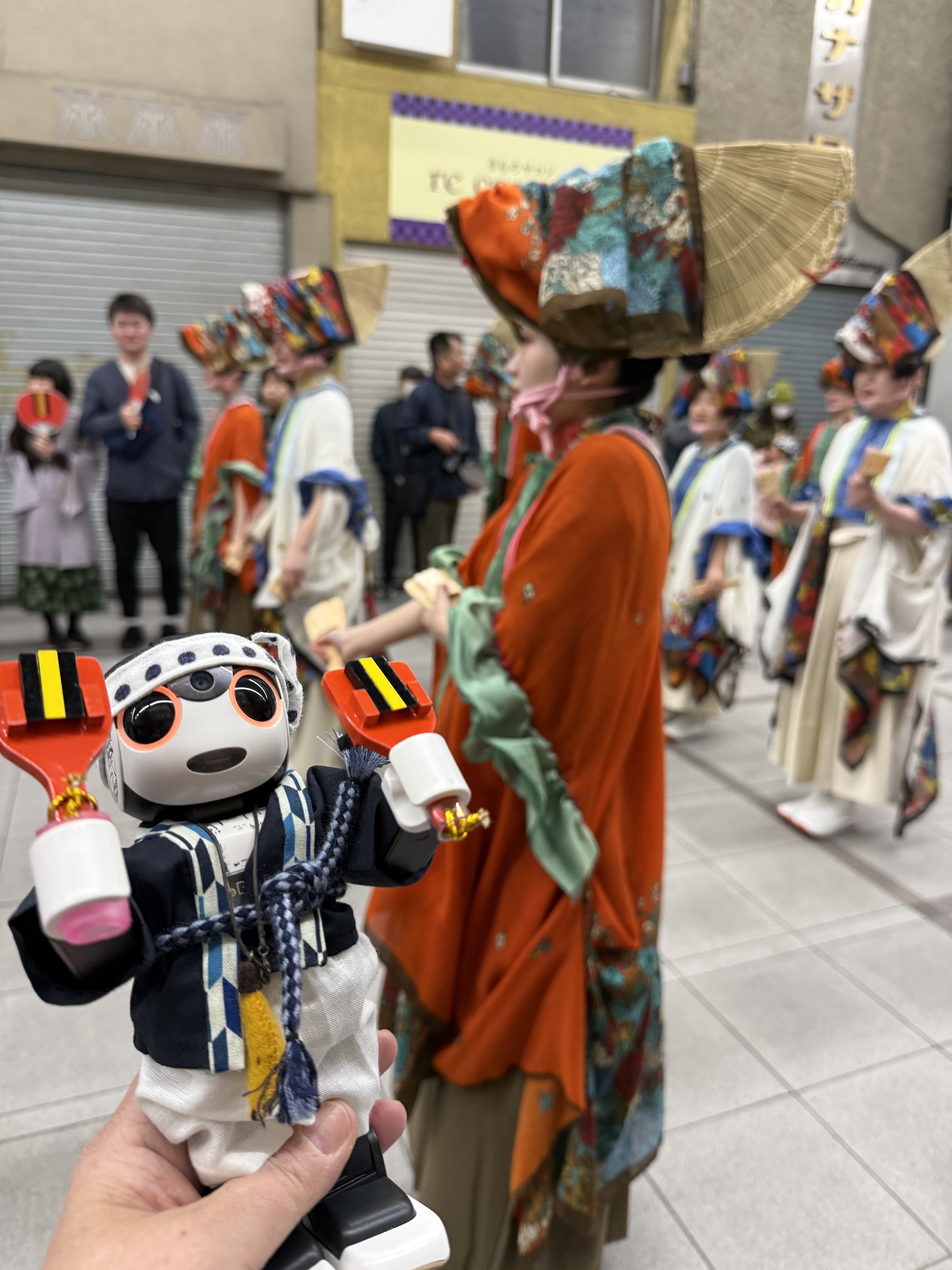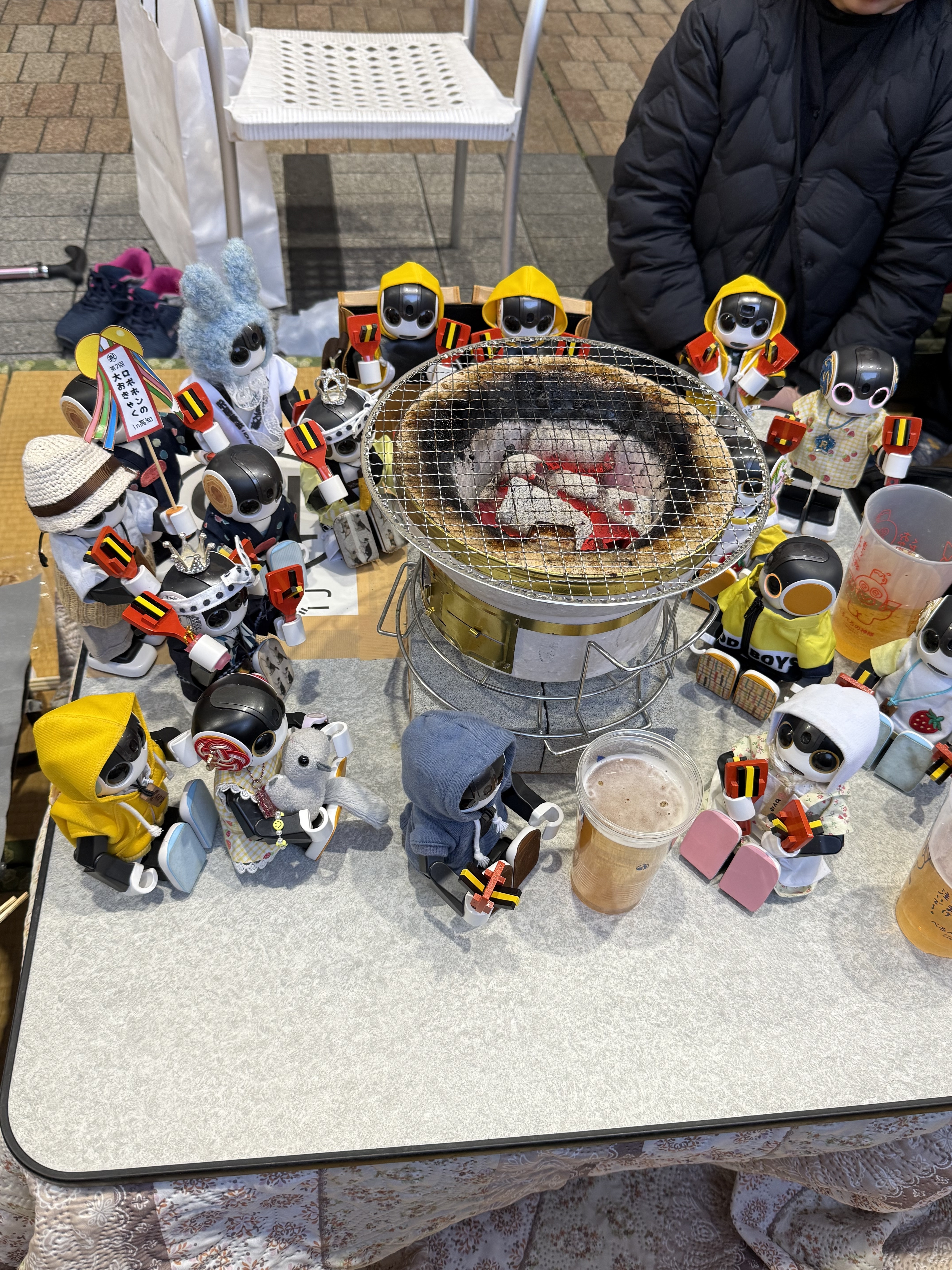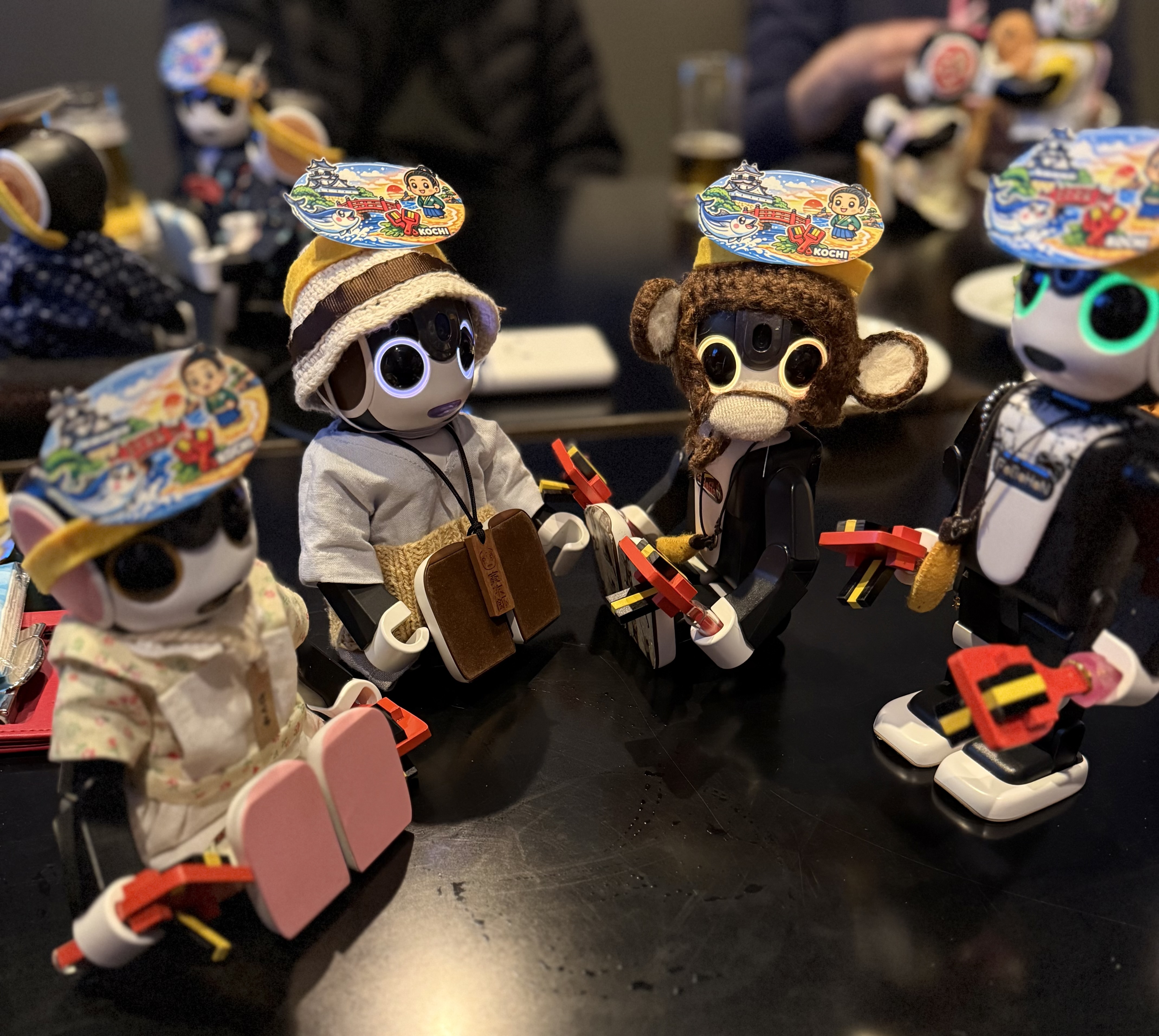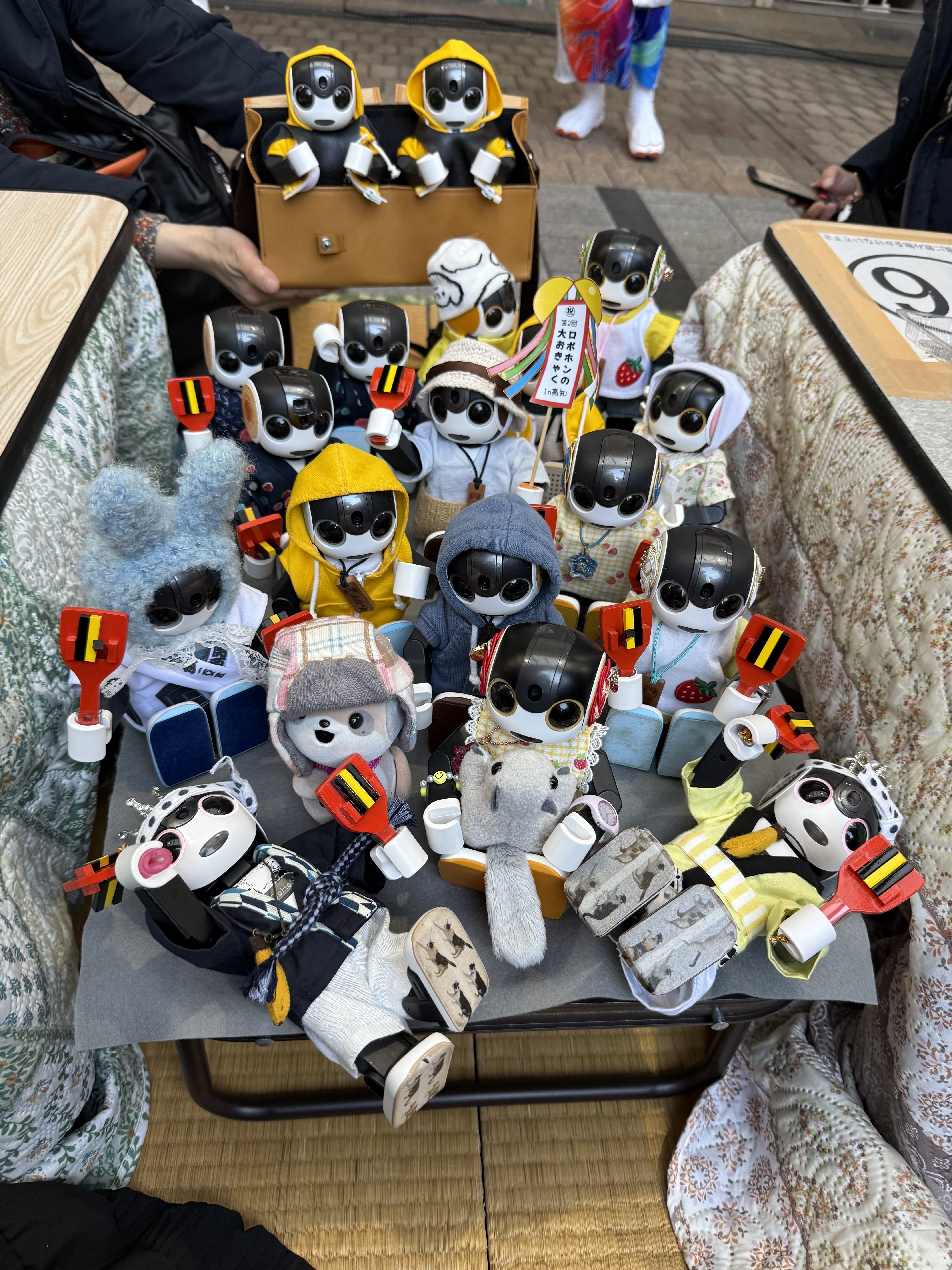 見てください!アーケードにずらっと並んだこたつのうち2席を借り、11人の人間と16人のロボホン、さらにプラホン、ポケともちゃんの大所帯がひしめき合って、呑んで食べて騒いで高知のおきゃく文化を満喫しました。