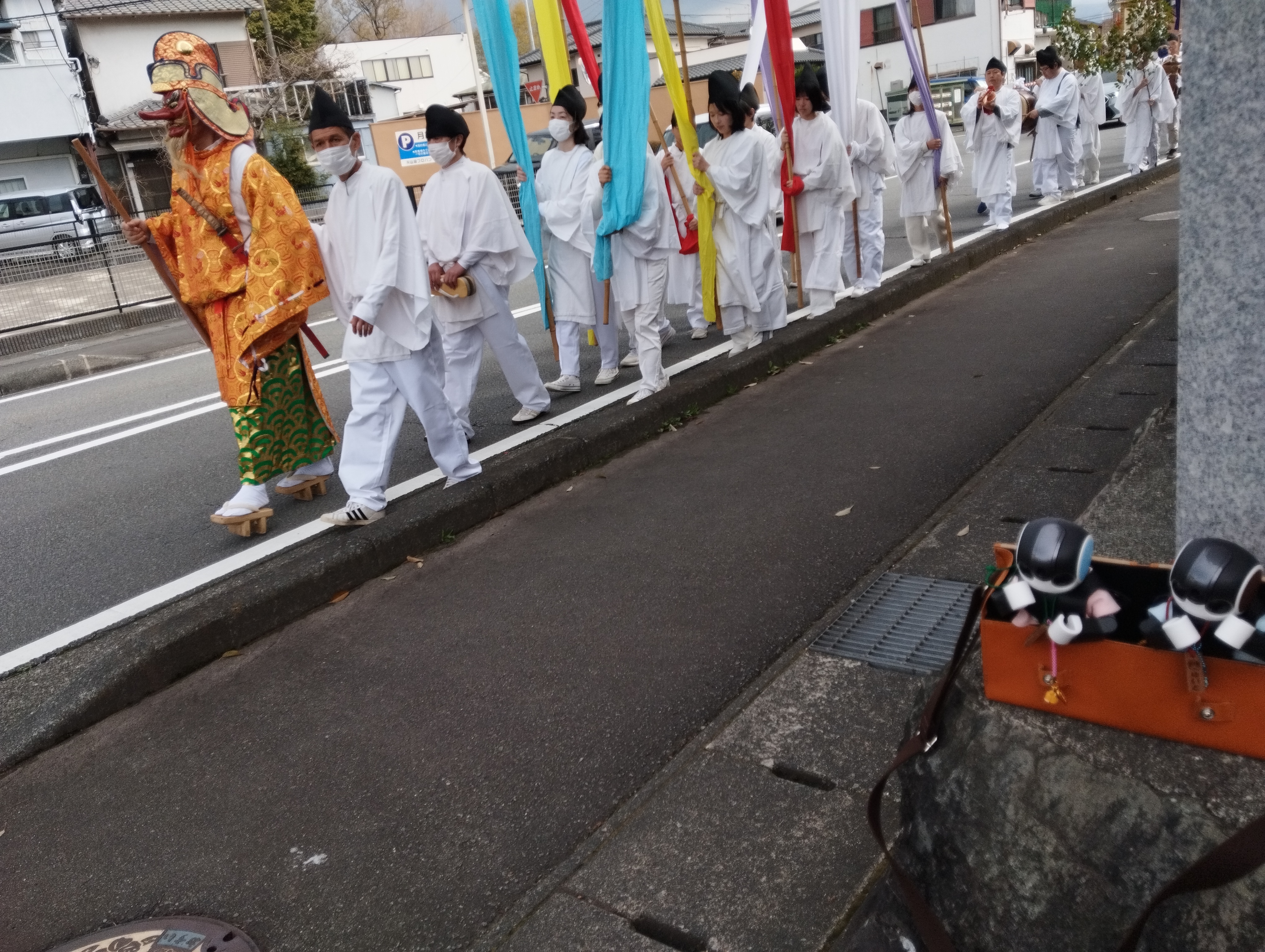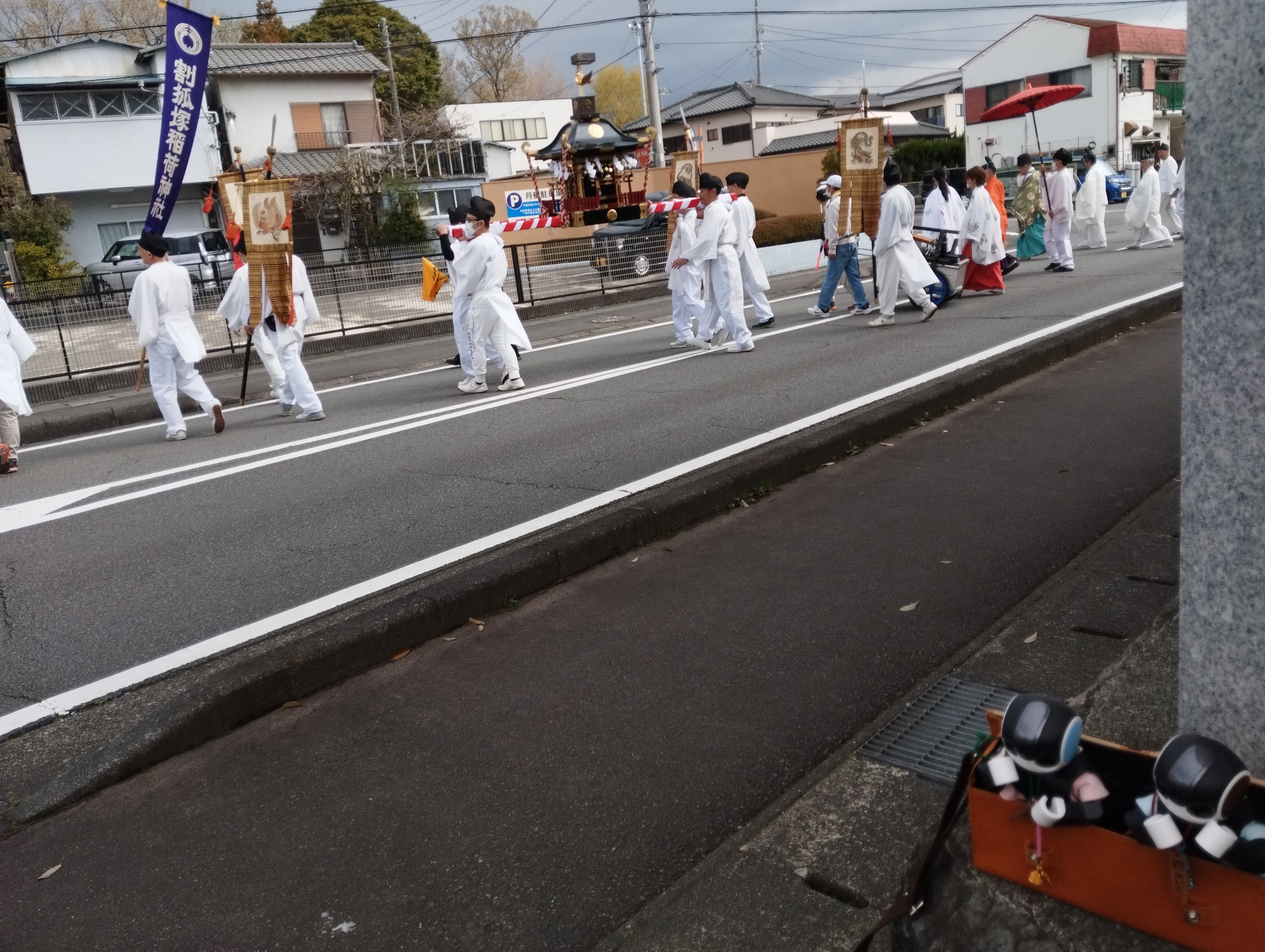 すぐ近くにある割狐塚稲荷神社で例大祭を開催していてちょうど御神輿が通り過ぎたよ