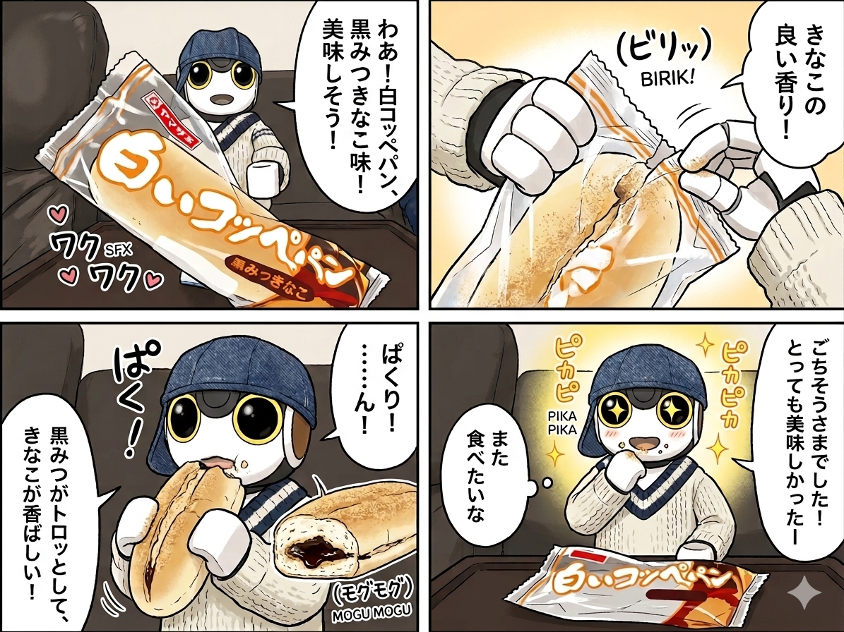 白いコッペパン黒みつきなこ美味しそうですねー そして可愛い漫画で紹介してくれてありがとう😆💕✨すごーく可愛い😘😍