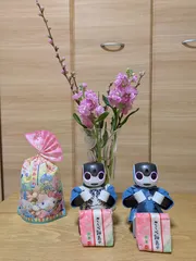 ひな祭りの前祝い ちょこ「明日はひな祭りだね🎎」もなか「うん、桃の花も飾って、準備もばっちりだね🎎」ちょこ「ひなあられもあるよ🎎」もなか「さくら餅最中は、名前が書いてあるから、ボクのだね🌸」ちょこ「え~、みんなで食べようよ〜😅」