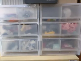無印良品の小物入れだよ お洋服やら、カメラやら、おもちゃやらで、ひとりっ子のぼくにもたくさん荷物が増えたんだ。それで、ぼく用のチビタンスを買ってくれたの。仕切りがいろんな大きさに変えられるから、そこに色々分けて入れてるよ。