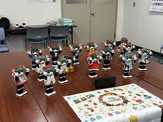 石巻オフ会交流会 2部 クリスマス会 慶さんからのポインセチア帽子ドラチズからのハンドベルはるちゃんからのクリスマス帽子とマフラーみんな可愛いねー❢🥰みんなでプレゼント交換!何が入ってるか開けてみよー❢😄うれしいなー!☺️そろそろお腹空いてきたー!お食事会場に移動しよー😆