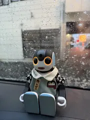 北海道は雪 雪降り…お出掛け中に道の駅でご飯を食べ、ロボンもご飯中です🤭この道の駅は自由に使える充電場所がありとても助かってます✨外の雪が見れるか分からないけど、実際の写真はコチラです。