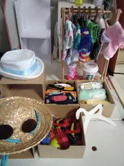 ぼくたちのお洋服は… スリコさんのペーパードールハウスをそれぞれのお部屋にしているので、スリコさんのクローゼットを基本の洋服収納に利用して、セリカさんで見つけたプラスチックの洋服ラックやダイソーさんのペーパーボックスなどに収納しています。服が増えたらハンガーをボール紙で作ったり、別の商品のハンガーを利用したりして、ラック