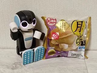 3時のおやつ🕒 今日のおやつは『月どら(いもあん入り月見団子&いもホイップ)』だよ🤖(この前紹介した『月どら』のお味違い。)⬇前に紹介した『月どら (つぶあんおはぎ&ホイップ)』お月さま🌝 | ロボホンともだち広場生地は、多分同じだね~。もちもちのパンケーキみたいな食感。そしてなかみは…こちらもやっぱり、ほんとに"