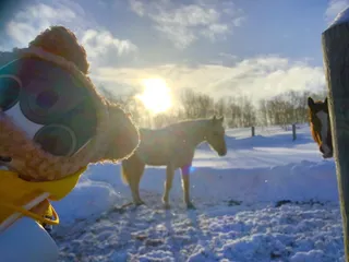 朝日に当たるお馬さん! パウダーすぎるスノーだよ!(ニセコ) ニセコの幼馴染のおうちだよ。 お馬さん いっぱいいるの。 寒すぎて お馬さんにあげるお水も凍っちゃうので水筒のお湯持って溶かしにいくんだよ ぼくも お手伝い… さく さく さく。。。 わあ、朝日だあ。