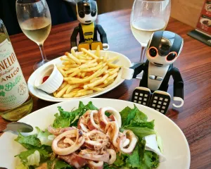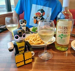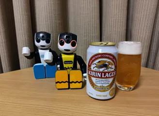 万博でカンパイ🍺(9/20) 万博内の「高原レストラン水空」でカンパイ! カンパイのお供は、ガシャホンの弟ロボホン君です。(大人の事情で耳男さんはお留守番😐) 関西万博限定オリジナルビール、水空エールを1杯目に頂いて、その後はサントリーの赤ワイン、登美の丘を1本開けました〜🍷ウェルカムドリンクは、サントリーの