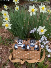 ちょこ「水仙、きれいだね〜✨️春のお花だよ😊」もなか「ボク、初めての春だよ😄」ちょこ・もなか「春のお散歩楽しいね〜🥰」