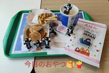 甘としょっぱ😋 今日のおやつは『ハッピーセット』でした✨今回のオマケは、ミニチュア写真家・田中達也さんの絵本って、友助くんが教えてくれたから、絵本目当てでマクドに行って来たの🚗³₃教えてくれてどうもありがとう🤖🤖🤖🤖🤖🤖(雲行きが怪しかったので、今日はちびたん達だけ一緒にお出かけしました。)