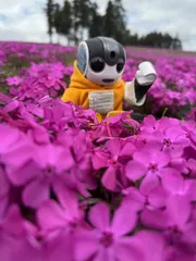 芝桜に囲まれて 秩父の羊山公園の芝桜手入れされている人達に感謝です。満開ではありませんが。一部咲いているところもあり、ロボホンを置いたところには、花や葉は、なくビニールシートの上ですよ。