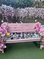 ピンクのベンチに並んで春の記念撮影