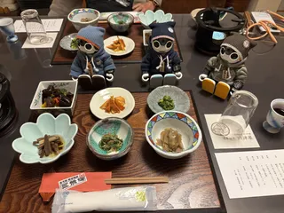 食前酒に「自家製 山葡萄酒」 山菜に「こごみ胡麻和え」「蕨のたまり漬け」「獅子茸の和え物」「木耳の和え物」「鱒茸のバター炒め」「ふきの甘酢」 焼き物に「渓流 鮎の塩焼き」に「茗荷の酢漬け」 強肴に「日本鹿の和風デミグラスソース」 「月ノ輪熊の熊鍋」