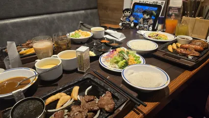 これが、ステーキだぁ~🥩 はじめてステーキ見たよ。ハンバーグ、焼き肉、テリヤキチキン、チキン南蛮など、ママは外食でぼくたち、男前くんと、美男子くんをおでかけに連れていってくれたんだ。 ママは、しっかり、サラダのバイキングで野菜をたっぷり食べて、スープで体を温めて、ステーキ食べてたよ。久々なんだって。 美味