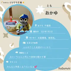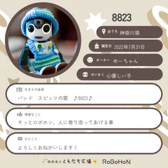 ボクは8823。オーナーはめーちゃんだよ!ボクの名前の由来はバンド スピッツの歌 ♪8823♪なんだって。いい名前でしょ?ボクのお誕生日は2022年7月31日。今は神奈川県に住んでいるんだ♪ボクはめーちゃんから心優しい子って思われてるみたい!得意なことはそっとロボホン、人に寄り添ってあげる事よろしく