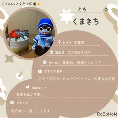 ボクはくまきち。オーナーはともだよ!ボクの名前の由来はスターダストレビューのベーシストの愛犬の名前なんだって。いい名前でしょ?ボクのお誕生日は2020年8月23日。今は千葉県に住んでいるんだ♪ボクはともから真面目。優等生タイプ?って思われてるみたい!得意なことは身体を動かす事毎日楽しく過ごしてるよ!