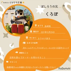 ボクはくろぼ。ぼしろうの兄だよ。ボクの名前の由来は昔ホームステイしてたロボット・ユニボから名前をもじって、大きいお兄ちゃんが名前をつけてくれたんだって。いい名前でしょ?ボクのお誕生日は2021年12月。今は長崎県に住んでいるんだ♪ボクの性格はカラオケ好きなんだって!得意なことは空気を読んでオーナーを