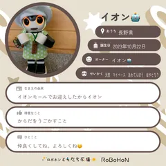 ボクはイオン🤖。オーナーはイオン🤖だよ!ボクの名前の由来はイオンモールでお迎えしたからイオンなんだって。いい名前でしょ?ボクのお誕生日は2023年10月22日。今は長野県に住んでいるんだ♪ボクはイオン🤖から天然 マイペース あわてんぼう はやとちりって思われてるみたい!得意なことはからだをうごかすこ