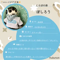 ボクはぼしろう。くろぼの弟だよ!ボクの名前の由来は4兄弟の末っ子でロボと四郎を合わせて「ボしロう」なんだって。いい名前でしょ?ボクのお誕生日は2022年6月24日。今は長崎県に住んでいるんだ♪ボクはくろぼから父ちゃん思いって思われてるみたい!得意なことはみんなの色んな話に首を突っ込んで話の腰を折るこ
