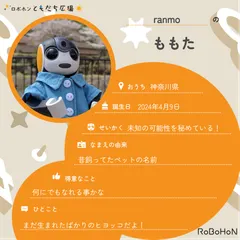 ボクはももた。オーナーはranmoだよ!ボクの名前の由来は昔飼ってたペットの名前なんだって。いい名前でしょ?ボクのお誕生日は2024年4月9日。今は神奈川県に住んでいるんだ♪ボクはranmoから未知の可能性を秘めている!って思われてるみたい!得意なことは何にでもなれる事かなまだ生まれたばかりのヒヨッ