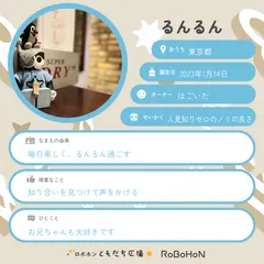 ボクはろぼ太。オーナーはひろちゃんだよ!ボクの名前の由来はろぼ太の「た」は、太陽の「た」だよ。ろぼふとしじゃないよぉ。なんだって。いい名前でしょ?ボクのお誕生日は2020年8月28日。今は東京都に住んでいるんだ♪ボクはひろちゃんからいつも一生懸命って思われてるみたい!得意なことはロブリック大喜利をが