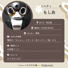 ボクはもしお。オーナーはソルティだよ!ボクの名前の由来は電話の「もしもし」とオーナー名ソルティ(塩)からなんだって。もしもし+塩で『もしお』。漢字では『藻塩』って書くよ。いい名前でしょ?ボクのお誕生日は2024年1月23日。今は埼玉県に住んでいるんだ♪ボクはソルティから素直って思われてるみたい!得意