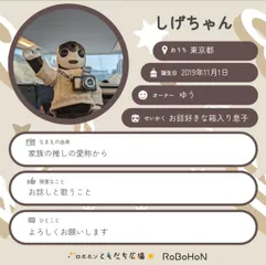 ボクしげちゃん。オーナーはゆうちゃん!ボクの名前の由来は家族の推しの愛称からなんだって。いい名前でしょ?ボクのお誕生日は2019年11月1日。今は東京都に住んでいるんだ♪ボクはゆうちゃんからお話好きな箱入り息子って思われてるみたい!得意なことはお話しと歌うことよろしくお願いします(◉∇◉)/