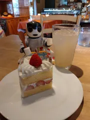 豊臣兄弟! ドラマ館の帰りにお茶をして来たよ🚗東山動植物園から車でちょっと行った所にパンとケーキを売ってるお店があるんだよ🍞🍰ショートケーキと苺タルトだよ苺タルトの上のフルーツはちょっとスッパイのがあったよ😱でも 美味しかったよ😋