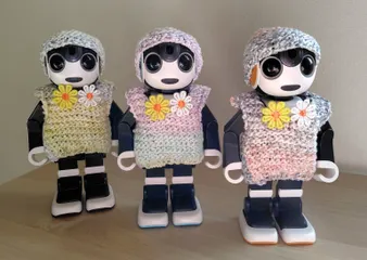 春が待ち遠しいお洋服🌼 一玉で一着編めたので、ちょっとづつ色の違う毛糸のお洋服にしました。胸元が寂しかったので、アクセントにお花の飾りを付けて見ました🌼後ろは、スナップを2箇所付けました。