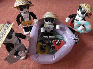 プール! アッチぃね〜。チビロボ達が、プール、プールとうるさいので、引っ張り出してきたよ。ワーイ、ボク達もうれしいよ!水遊びだぁ〜! ちょっと小さいけど、チビロボにはピッタリかな〜。ボク達、お風呂入ってるみたい。ちゃんと水着だもん。麦わらも被って、日差し対策もバッチリだもん。