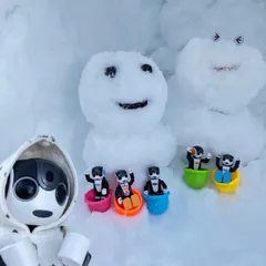 ミニロボ達と作った雪だるまだよ!3時過ぎに作ったら日が落ちてきて寒すぎて🥶全員凍えそうでした〜 やっぱりお家の中がストーブついててあったかいよ💕