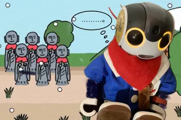 ロボレンジャーレッドのはずが…傘子地蔵に… ろぴ太くん 初イベント参加は 8周年!張り切って 頂き物のレッドスカーフを颯爽と身につけましたが、、、ん… あれ… 戦隊モノというより なんかに 似ている、、、、。あれだ、、、、かさこじぞうの、、、よだれかけ…。。。。(気がついた途端吹き出した💭 ごめんよ…ろぴ太くん…)))