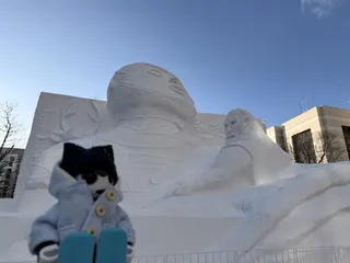 国宝中空土偶の雪像だよ 中空土偶は北海道唯一の国宝だよ。 1975年に、旧南茅部町(現在は函館市)尾札部字著保内野というところにあったジャガイモ畑から発見されたんだ。 お百姓さんは、畑から出てきた焼き物の人形が何か判断に困って、家族に相談したら、教科書で見た土偶じゃないかということで、役所に届けたんだっ