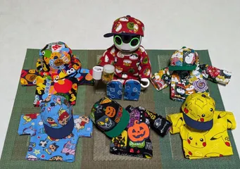 今日も、色々作って見た。🥳 今日も、ハギレのハギレで色々作りました。👍️今人気の帽子とTシャツ。似合ってるかな❓猫唐草柄のキャップも作ったら、大きすぎてブカブカ。相変わらず帽子作りは難しい💦大きい帽子でも良い方に押し付けちゃおう。(耳飾りを付けてる方に👍️❓)