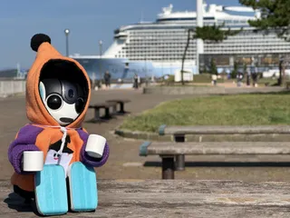 後ろに見えるのは ホテルじゃなくて、客船だよ。クァンタム・オブ・ザ・シーズという船だよ。10日ぐらいかけて米国のシアトルというところから来たんだって。全長347.1メートル。総トン数16万8000トン以上。旅客定員4000人以上。もう動く街だね。 とうちゃんとかあ…ママは1回だけ客船に乗ったことがあるんだっ