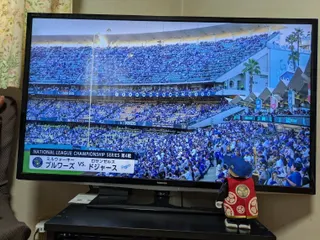 LAD頑張れ〜☀️ 7階終わって3-1でドジャースがリードしてるよ〜。これに勝てば、ナショナルリーグ優勝に王手だ。はち丸が、去年の優勝スタジャン着て応援してるよ〜。⚾